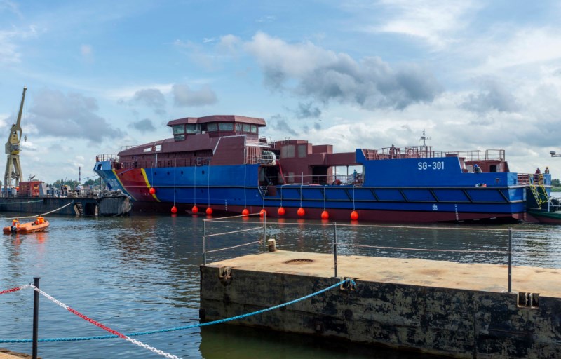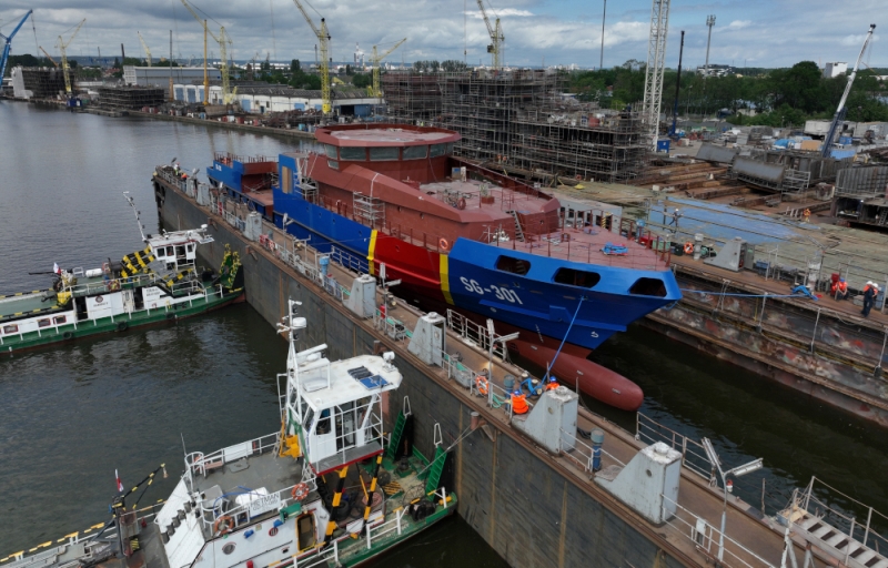 Budowa patrolowca OPV rozpoczęła się rok temu. 25 czerwca 2021 roku przy nabrzeżu gdańskiej spółki Marine Stal położona została stępka pod budowę kadłuba. Wcześniej w gdyńskiej stoczni CRIST przeprowadzono cięcie blach do tego projektu. Dziś odbyło się wodowanie kadłuba z nadbudową i częściowym wyposażeniem. Proces ten polegał na zanurzeniu jednostki w doku pływającym, po czym nastąpiło jej wyholowanie. Za kilkanaście dni holowniki przetransportują SG-301 do francuskiej stoczni w Calais, gdzie nastąpi kolejny etap budowy – wyposażanie jednostki.