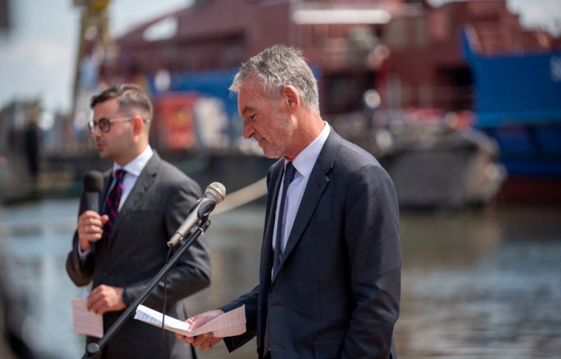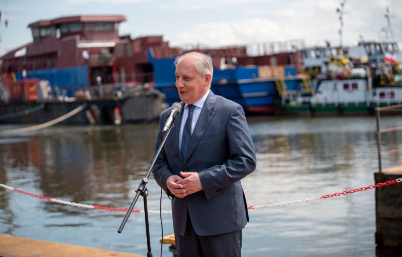 Wojewoda Pomorski przemawia podczas uroczystości zwodowania patrolowca SG-301 -