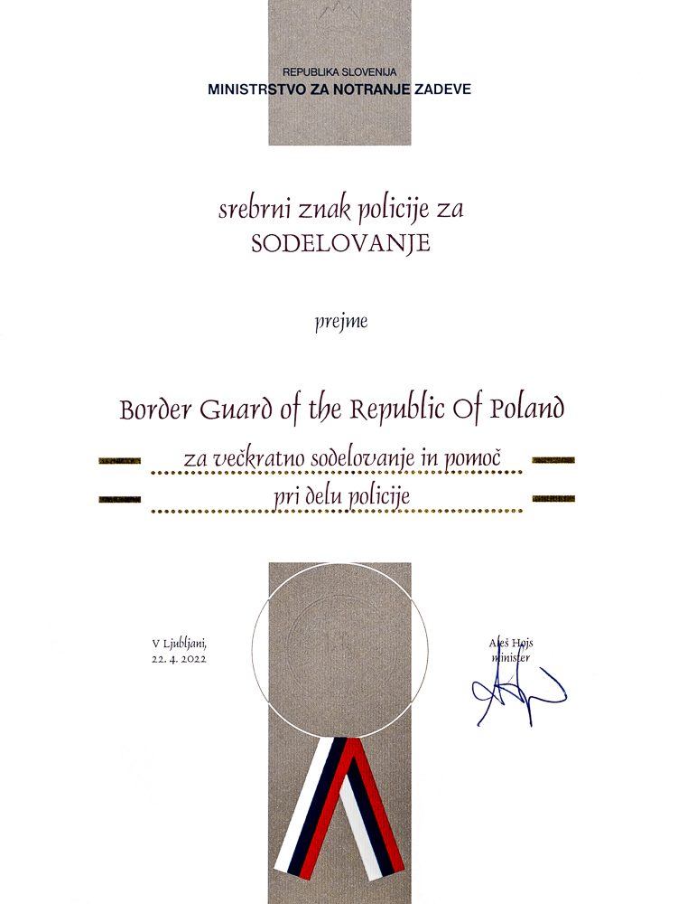 Srebrną Odznakę Policji odebrała z rąk ambasadora Bojana Pograjca, Z-ca Komendanta Głównego Straży Granicznej gen. bryg. SG Wioleta Gorzkowska. Ambasador w imieniu władz Słowenii podziękował funkcjonariuszom Straży Granicznej za udział w operacji bilateralnej w Słowenii, wyraził także słowa uznania dla profesjonalizmu polskich strażników granicznych.