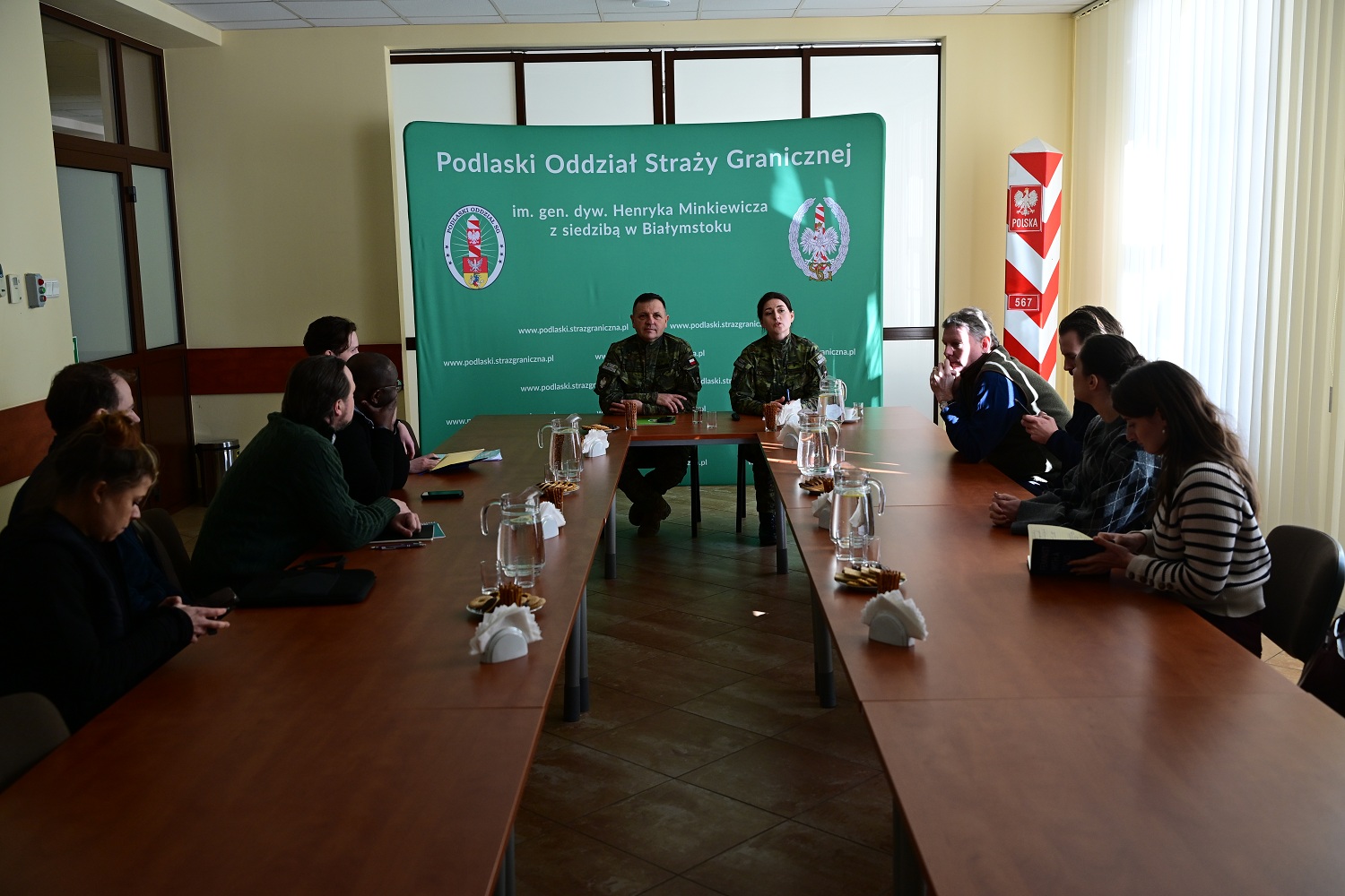 Wizyta rozpoczęła się prezentacją, na której przedstawiono aktualną sytuację migracyjną na odcinku polsko-białoruskiej granicy państwowej w Podlaskim Oddziale SG. Omówione zostały również główne zagrożenia, system ochrony granicy oraz dotychczasowe doświadczenia związane z zabezpieczeniem granicy.