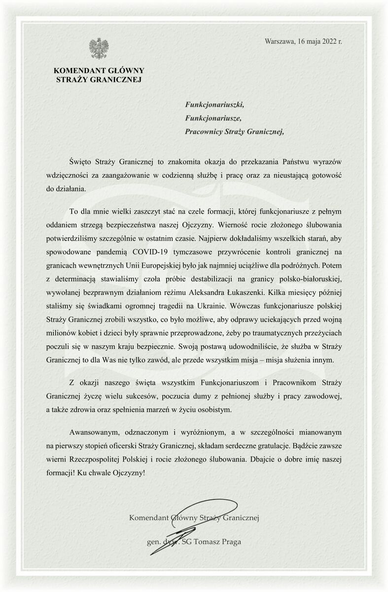 List od Komendanta Głównego Straży Granicznej - Aktualności