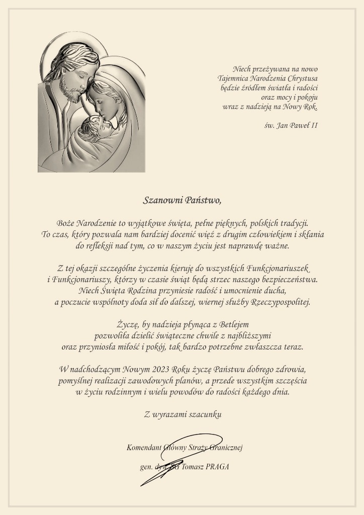 Komendant Główny Straży Granicznej gen. dyw. SG Tomasz Praga skierował szczególne życzenia do Funkcjonariuszek i Funkcjonariuszy, którzy w czasie świąt będą strzec naszego bezpieczeństwa.