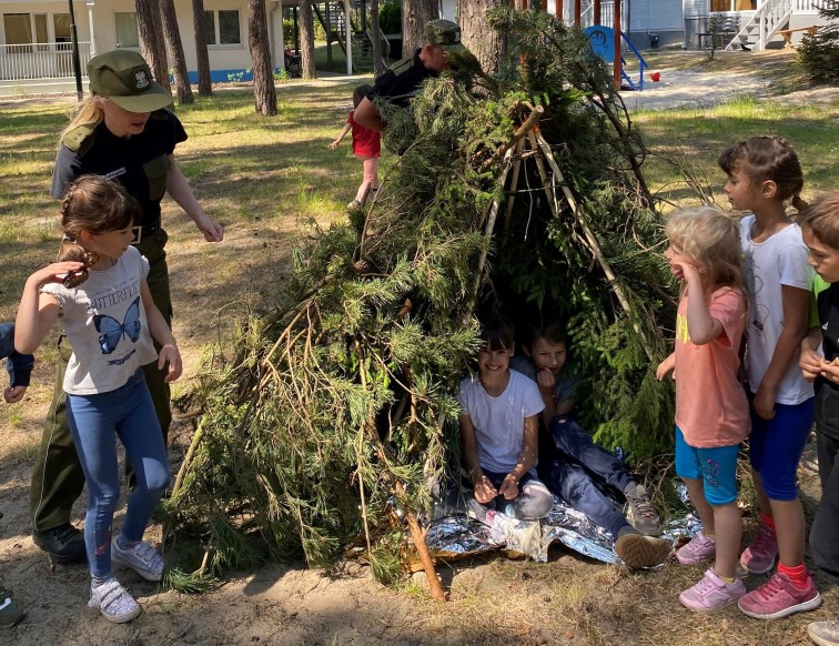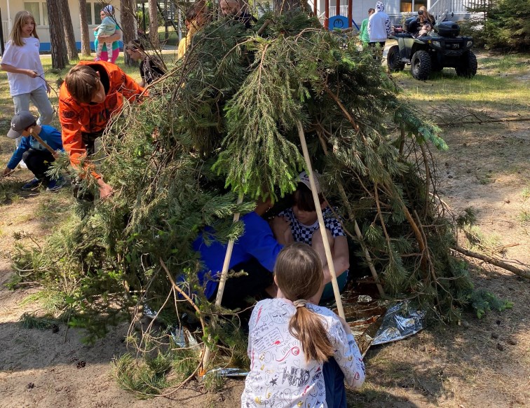 Ostatnim, najbardziej wymagającym elementem szkolenia, było budowanie schronienia w formie „namiotu tipi” oraz nauka zasad przetrwania w warunkach letnich. Dzieci uczyły się, w jaki sposób wykorzystać położenie oraz posiadane przy sobie lub wokół nich przedmioty. Każda z grup wiekowych ukończyła zadania celująco, pozostawiając po sobie oryginalne budowle oraz radosne wspomnienia.
