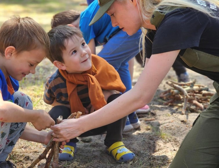 Funkcjonariuszka SG w trakcie zajęć z dziećmi uczestniczącymi w 1 edycji Warsztatów Survivalowych dla dzieci uchodźców wojennych z Ukrainy
