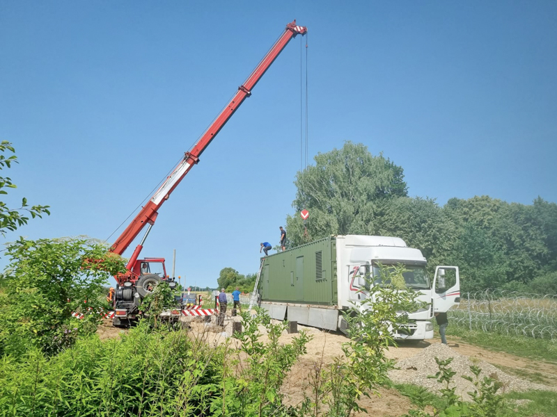 Wczoraj (5 lipca) postawiono kontener na odcinku PSG w Sępopolu, z kolei dziś stanął kolejny – na odcinku Placówki SG w Górowie Iławeckim. Cztery wcześniejsze stoją już na odcinkach placówek SG: w Węgorzewie, Dubeninkach, Gołdapi i w Sępopolu. Łącznie wszystkich ma być 12.