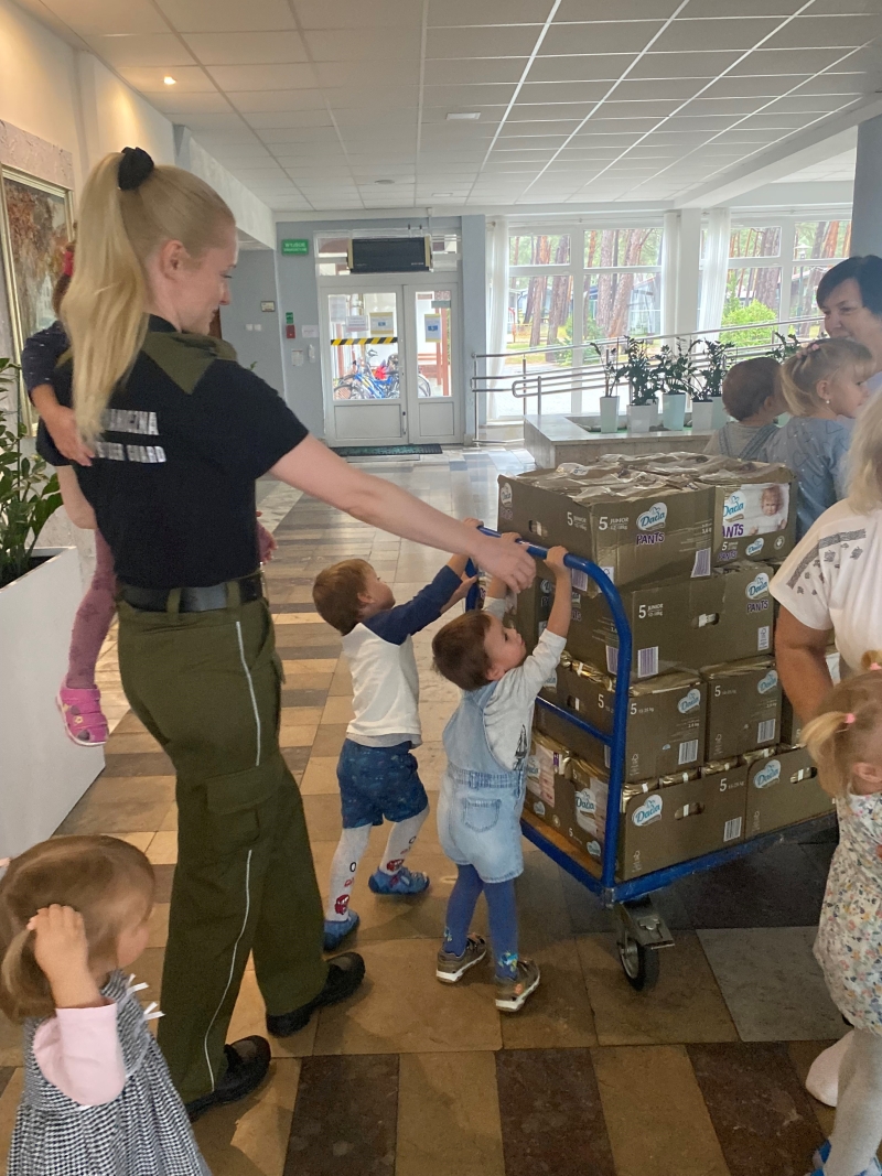 Doradca Komendanta Głównego SG ppor. Urszula Nowinowska przekazała dzieciom i opiekunom pomoc humanitarną dostarczaną przez Straż Graniczną regularnie od początku wybuchu wojny do m.in. ewakuowanych z Ukrainy do Polski domów dziecka.