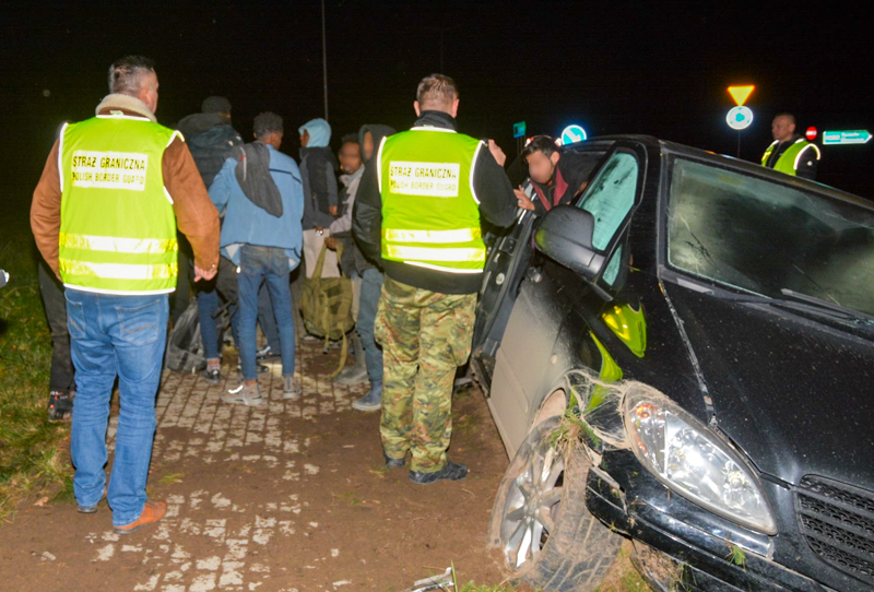 9 listopada, w powiecie ełckim, około 23.30 funkcjonariusze z Placówki SG w Gołdapi dali wyraźny sygnał do zatrzymania kierowcy busa. Ten zaś zignorował to i zaczął uciekać. Szybka jazda spowodowała, że kierujący mercedesem, na suwalskich numerach rejestracyjnych, nie zapanował nad nim i wylądował w rowie. W przestrzeni ładunkowej busa pozostawił 16 nielegalnych migrantów, sam uciekł do pobliskiego lasu. Zatrzymanym Somalijczykom i Syryjczykom nic się nie stało. W pojeździe funkcjonariusze Straży Granicznej ujawnili dwa komplety tablic rejestracyjnych: litewskie i polskie.