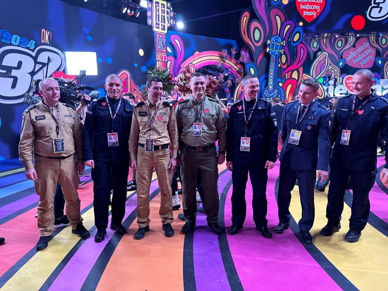 Komendant Główny SG gen. bryg. SG Robert Bagan wraz z szefami służb mundurowych w czasie 32. finału WOŚP -
