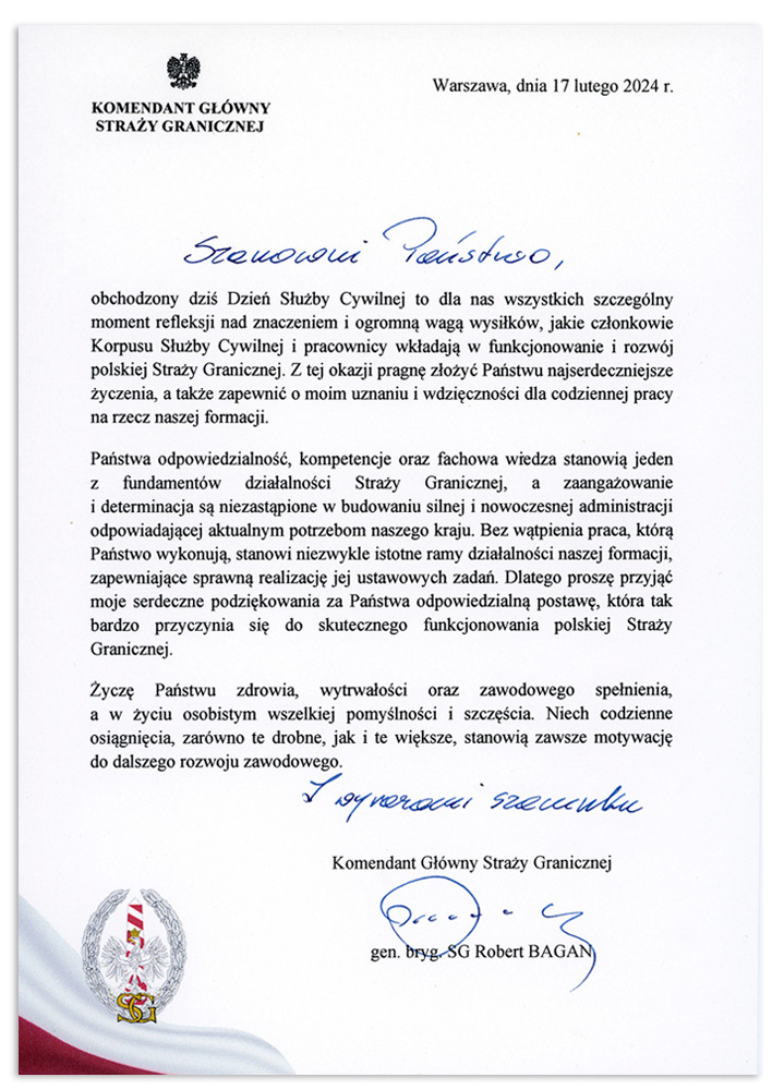 Życzenia Komendanta Głównego Straży Granicznej z okazji Dnia Służby Cywilnej - Aktualności