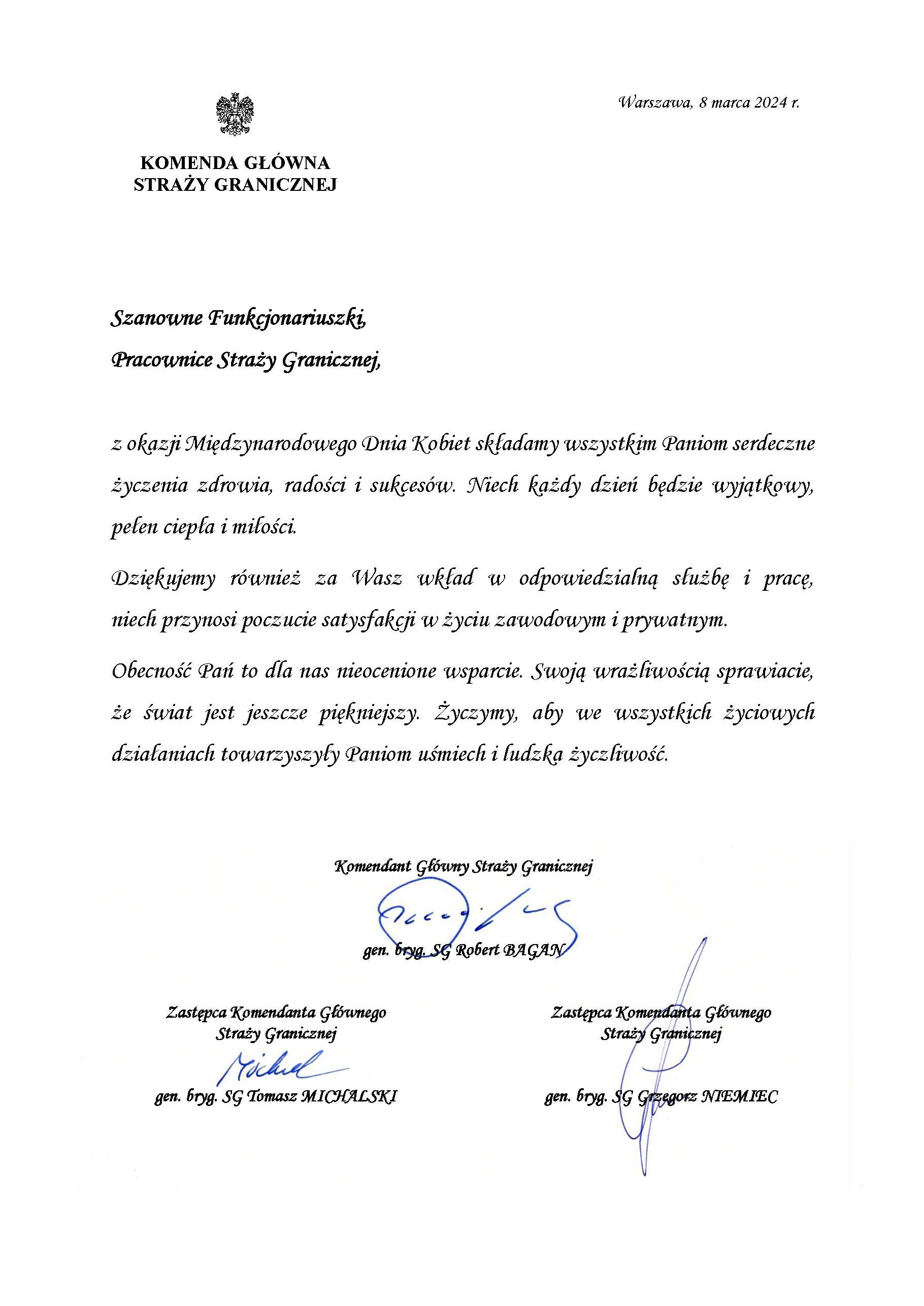 „Obecność Pań to dla nas nieocenione wsparcie. Swoją wrażliwością sprawiacie, że świat jest jeszcze piękniejszy” - pisze Komendant Główny SG wraz ze swoimi Zastępcami w liście skierowanym do Pań.