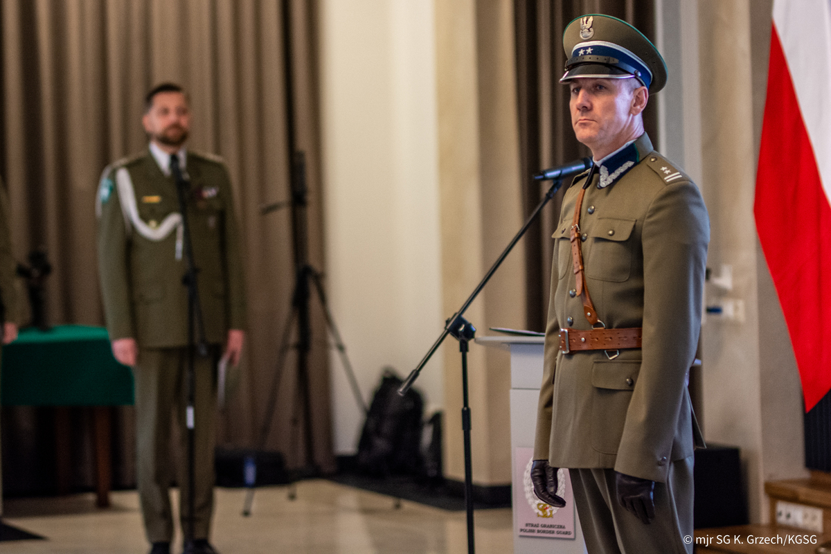 Funkcjonariusz Straży Granicznej rozpoczyna uroczystość z okazji Narodowego Święta Niepodległości w Komendzie Głównej Straży Granicznej -