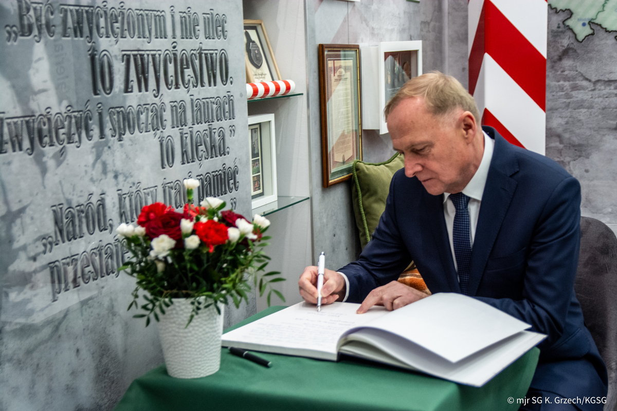 Minister Spraw Wewnętrznych i Administracji wpisuje się do księgi pamiątkowej.ej -
