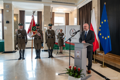 Szefowa Służby Cywilnej przemawia podczas uroczystości w Komendzie Głównej Straży Granicznej. -