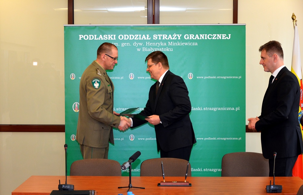 Umowę o przekazaniu środków finansowych na fundusz wsparcia Podlaskiego Oddziału Straży Granicznej podpisali: Marszałek Województwa Podlaskiego Jerzy Leszczyński, wicemarszałek Maciej Żywno i Komendant Podlaskiego Oddziału Straży Granicznej płk SG Andrzej Rytwiński .