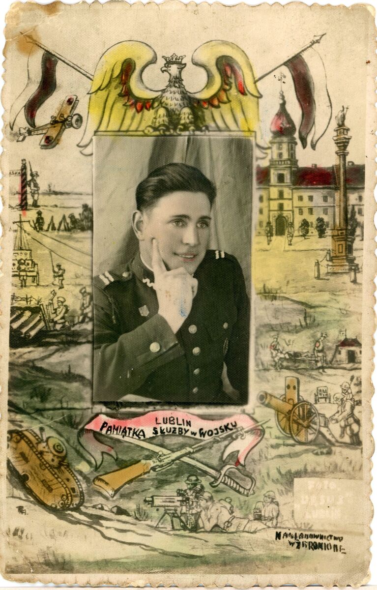 Dyplom na pamiątkę służby z koloryzowanym zdjęciem.